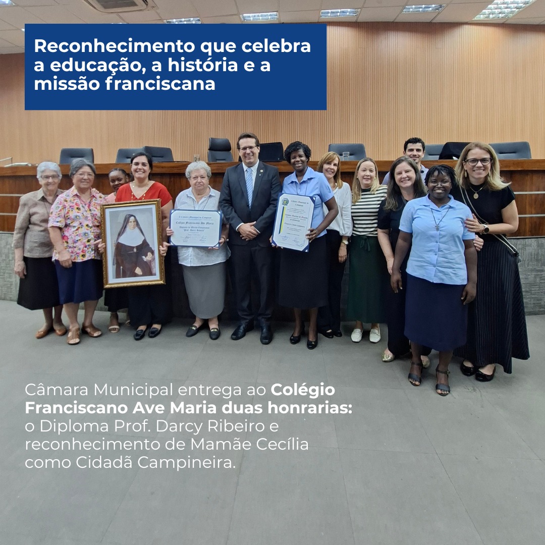 Na noite de terça-feira, 7 de abril de 2026, o Colégio Franciscano Ave Maria foi homenageado pela Câmara Municipal de Campinas. A instituição recebeu o Diploma de Mérito Educacional Professor Darcy Ribeiro, uma das mais importantes honrarias da educação no município.