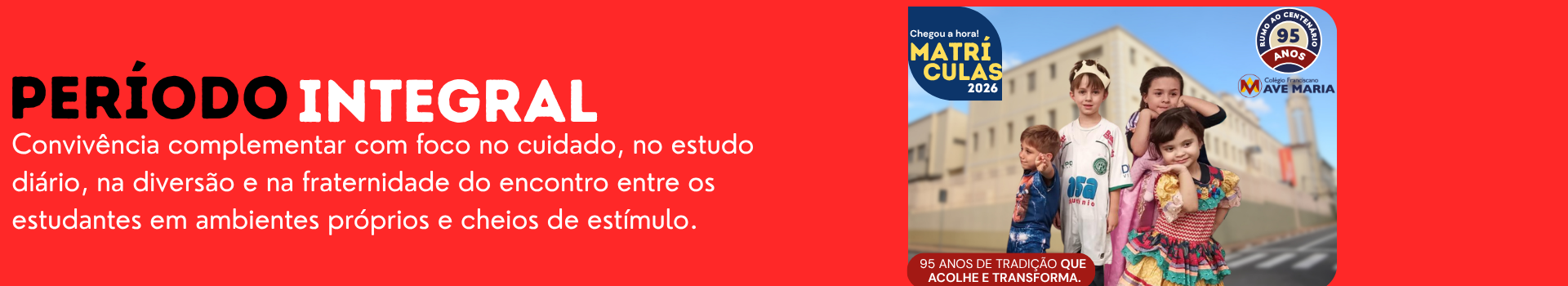 O Período Integral no Colégio Franciscano Ave Maria é uma extensão do turno regular e oferece uma proposta educativa completa. Disponível para alunos do Infantil 2 ao 7º ano do Ensino Fundamental, em um ambiente planejado para atender às necessidades de quem permanece o dia todo na escola. Com atividades orientadas por faixa etária, o Período Integral promove o desenvolvimento, respeitando os tempos de brincar, descansar e estudar.